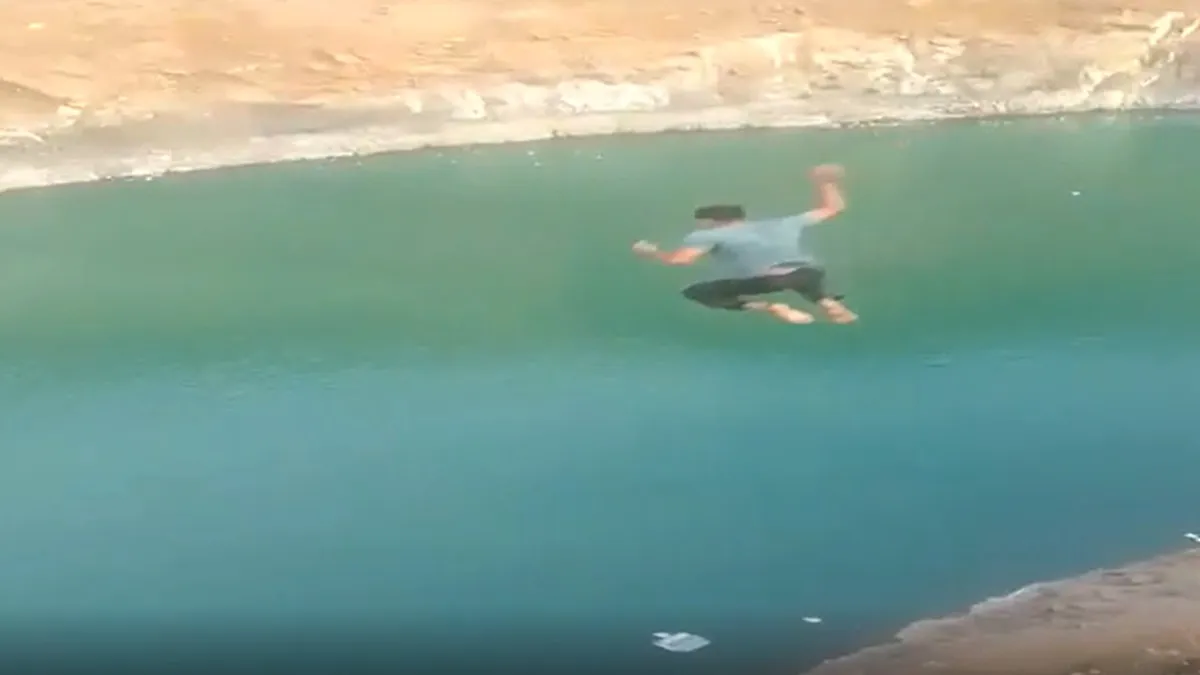 The victim was identified as Tausif. His calculation to jump into a quarry lake from a height of about 100 feet on Monday evening went wrong and he drowned moments after jumping. The viral video showed that he ran a few meters before leaping towards the lake. When his friends realized that, Tausif was drowning, they ran to save him but it was too late.