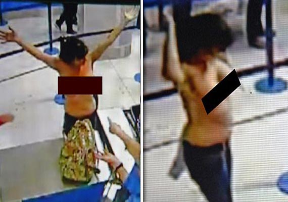 Both strip down to their bras but Hadfield-Hyde then removes hers as staff and passengers look on.