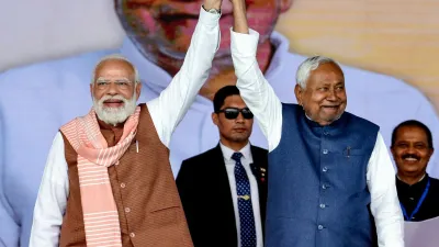 Bihar CM Nitish Kumar with Union Minister Giriraj Singh at the Gandhi Maidan in Patna.