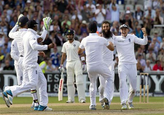 Part-time offspinner Moeen Ali finished with figures of 4-39, sparking India's collapse from 53-2 to 66-6 on day three as England pressed hard for an early finish to the match with bad weather forecast.