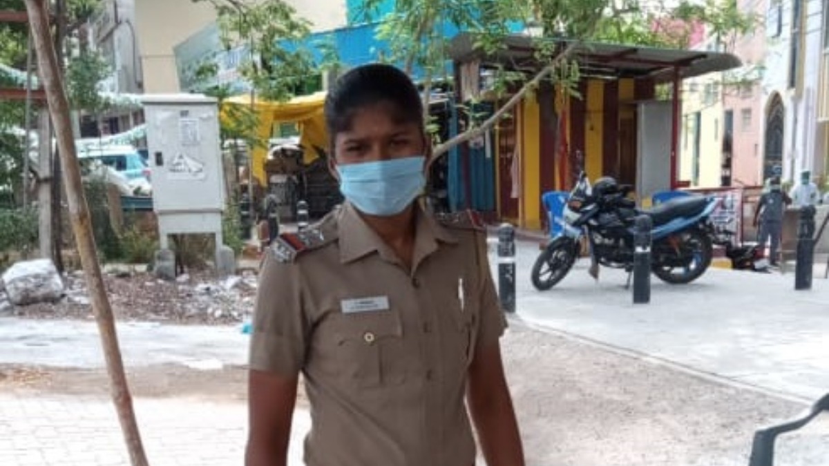 Wearing the traditional 'khaki' uniform of the Tamil Nadu Police, along with a surgical mask over her face and a pair of gloves pulled over her hands for protection, Indumathi is barely recognisable to those stopped by her for checking at Anna Nagar in Chennai.