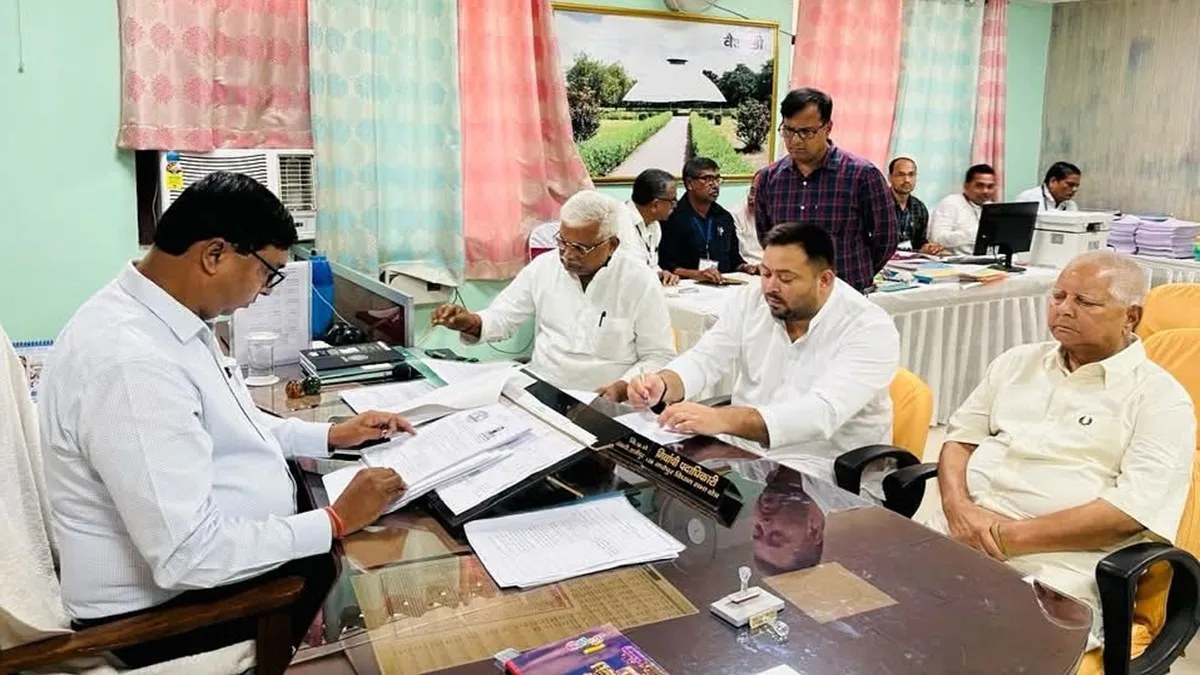 Tejashwi Yadav, aged 35, filed his nomination papers at the collectorate in Hajipur, the headquarters of Vaishali district, in the presence of father Lalu Prasad, the RJD president, and mother Rabri Devi.