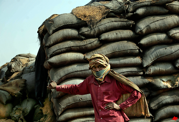 In Khamanon village in Punjab state, farm workers Wednesday picked out grains from a mound of mildewed wheat, trying to salvage what was still edible.