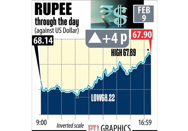 However, it recovered from initial losses to 67.89 per dollar on selling of dollars by banks and exporters before concluding at 67.90 per dollar, showing a gain of four paise or 0.06 per cent.
