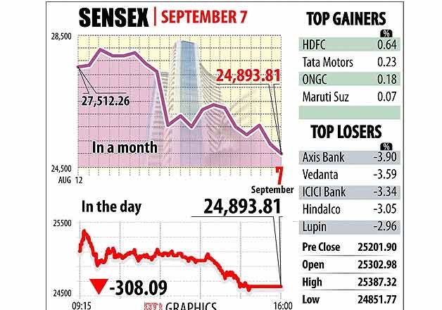 The 30-share index after opening positive at 25,302.98, advanced to a high of 25,387.32 in early trade. However, it succumbed to profit-booking and slipped below the 25,000-mark to touch a low of 24,851.77 points, before ending 308.09 points or 1.22 per cent down at 24,893.81.