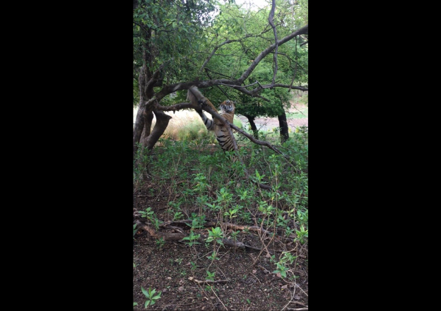 The happening caught the tourists’ attention when they saw the tigress jumping on a tree in an attempt to catch the monkey. The tigress did not want to kill the monkey, but was instead seen in a jovial mood trying to play around the jungle.