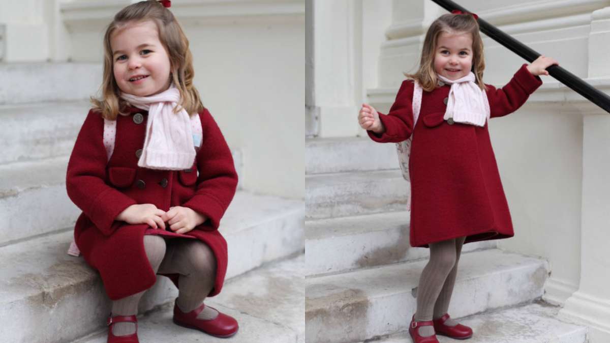 The royal girl looks excited and posed happily for photographs before beginning a new journey of her life. Charlotte looked adorable in deep maroon overcoat, grey leggings with powder pink muffler and backpack. The images have been clicked by her mother Kate Middleton.