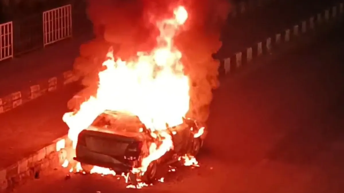 A Swift Dzire car caught fire under the Patparganj flyover in Delhi, quickly engulfing the vehicle in flames. Eyewitnesses were stunned as the car was reduced to ashes in a matter of moments.
