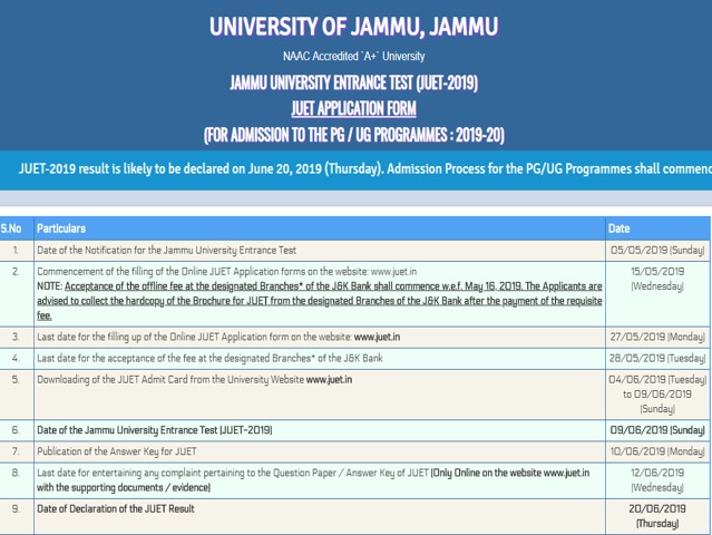 The Jammu University is expected to release Entrance Test or JUET 2019 results on its official website today. Candidates who have appeared in the entrance exam are requested to keep eye on the official website of Jammu University to check their results.