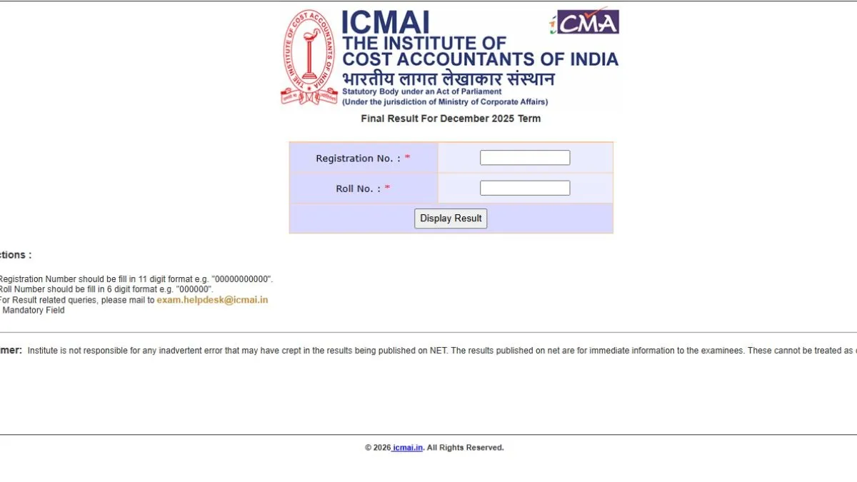 The Institute of Cost Accountants of India (ICMAI) CMA final scorecard link is eicmai.in. The candidates who had appeared for the CMA final exam 2025 can check the result on the official website- eicmai.in. The ICMAI CMA final December scorecard PDF login credentials are- registration number, roll number.