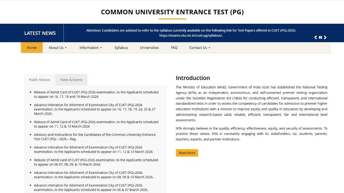 The National Testing Agency (NTA) has released the Common University Entrance Test (CUET PG) admit card 2026. CUET PG hall ticket has been released for March 16, 17, 18 and 19 exams. The candidates can check and download the CUET PG hall ticket on the official website - exams.nta.nic.in/cuet-pg. The CUET PG hall ticket login credentials are - application number, password.