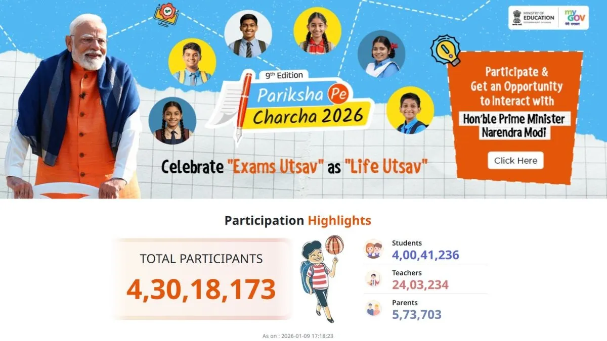 The Pariksha Pe Charcha 2026 registration will be closed tomorrow, January 11. Over 4.30 crore (4,30,18,173) participants applied for the Pariksha Pe Charcha till now; out of which over 4 crore (4,00,41,236) are students, teachers- 24.03 lakh (24,03,234), parents- 5.73 lakh (5,73,703). Last year, Pariksha Pe Charcha 2025 set Guinness world record with 3.53 crore registrations. Pariksha Pe Charcha has been awarded the Guinness World Record for registering the “most people on a citizen engagement platform in one month.”