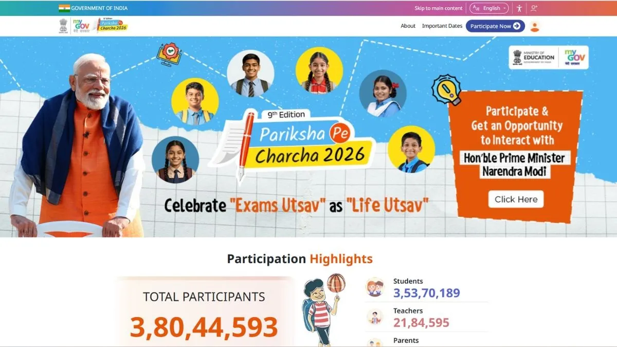 The Pariksha Pe Charcha 2026 registration is about to reach 4 crore mark, with five days still remaining for the application process to be closed on January 11. Over 3.80 crore (3,80,44,593) participants applied for the Pariksha Pe Charcha 2026 till now, students- 3.53 crore (3,53,70,189), teachers- 21.84 lakh (21,84,595), parents- 4.89 lakh (4,89,809).