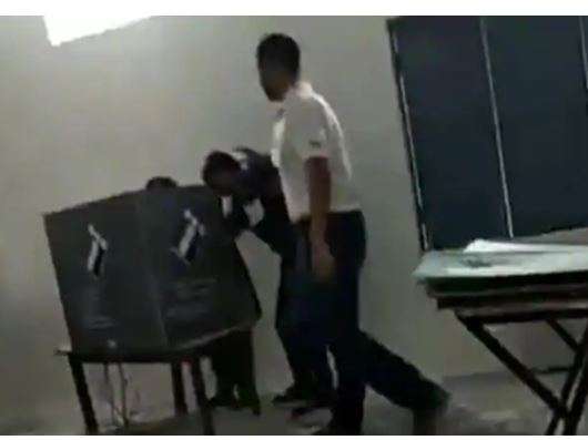 In the video, the polling agent, wearing a blue shirt, can be seen walking up to the polling booth as a woman prepares to cast her vote. He appears to press a button on the EVM or pointing to a party symbol and then promptly returns to his seat inside a polling booth at Asaoti in Faridabad Lok Sabha constituency.
