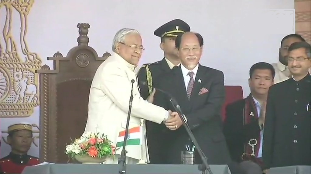 The new Nagaland government headed by NDPP leader Neiphiu Rio took oath at a public function in Kohima today. Governor P B Acharya administered the oath of office and secrecy to Rio and the 11 ministers at the main rostrum of the ground, in the presence of BJP president Amit Shah and Defence Minister Nirmala Sitharaman.