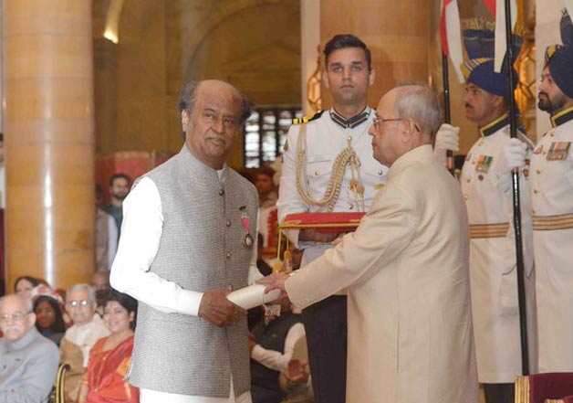 New Delhi: Southern megastar Rajinikanth was on Tuesday honoured with the Padma Vibhushan, India's second highest civilian award, by President Pranab Mukherjee at a glittering ceremony at the Rashtrapati Bhavan here.