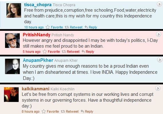 Mumbai, Aug 15: As Bollywood personalities conveyed their greeting on Independence Day and expressed their sense of pride in being Indians, the issue of corruption was clearly on the minds of many of them.