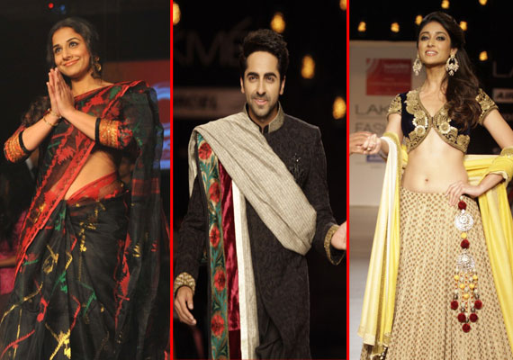 Mumbai, March 28: Vidya Balan, Siddarth Roy Kapur, Amrita Rao, Riteish and Genelia, Arbaaz Khan and Malaika Arora Khan, Shatrugan Sinha, Ashutosh Gowariker and Anurag Basu walked the ramp in desi outfits showcasing designer Vikram Phadnis fashion line at LFW Summer-Resort 2013 on the theme of celebration of rural India, hereon Monday.