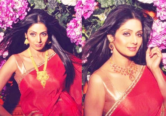Mumbai,Apr 20:Actress Sridevi looked stunning as she posed for jewellery brand Tanishq in a red and golden sari.