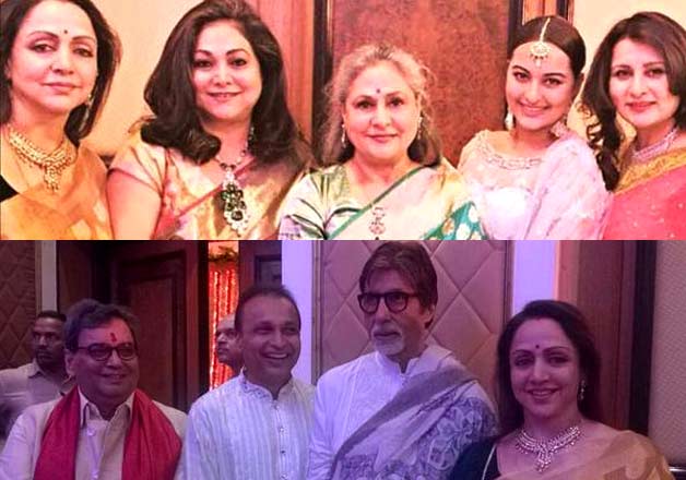 Sonakshi, who looked gorgeous in a blue lehenga-choli, pearls and a kundan maang-tika, also posted a picture with Hema Malini, Jaya Bachchan, Tina Ambani and Poonam Dhillon, looking elegant in their authentic silk sarees.
