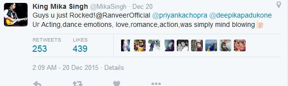 And now, the Bollywood has come forward to hail Bajirao Mastani and its stars Ranveer Singh and Deepika Padukone. The Twitter wall of both the actors is filled with the appreciation messages from big stars.