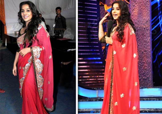 The designer of the saree Riyaz Gangji says: "Balaji Films wanted me to design sarees for Vidya that she was supposed to wear for the film's promotions. I have designed three sarees for her so far. She's already worn one for the Bigg Boss and she's yet to wear the others. with red as the main colour, I have used gota work on the border and small peacock motifs in green and blue for the saree."
