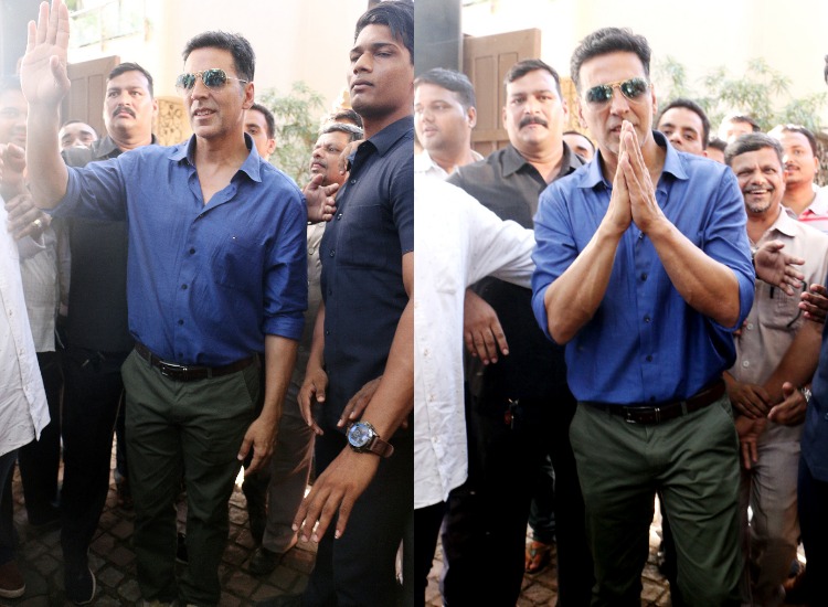 Akshay met his fans sporting a neat and clean look. He was dressed all formal in a blue shirt, grey trousers and golden framed black-tinted aviators.. In the pictures he is seen all smiles and waving to his fans gathered outside his house.