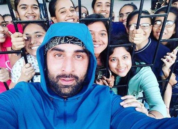 In the picture, Ranbir is in the front capturing the moment with his fans. Sporting a blue hooded sweatshirt with a black headband and stubble, Ranbir is oozing hotness while his female fans can be seen beaming with joy.