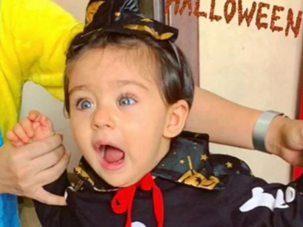 Inaaya is dressed up in a skeleton print outfit and is seen trying to scare people with her spooky avatar that is so cute that it can melt even the coldest of hearts. Captioned as, "Peek a boooo!! #happyhalloween in case you are wondering I’m a size zero witch #scarytrends", check out the photo we are talking about.