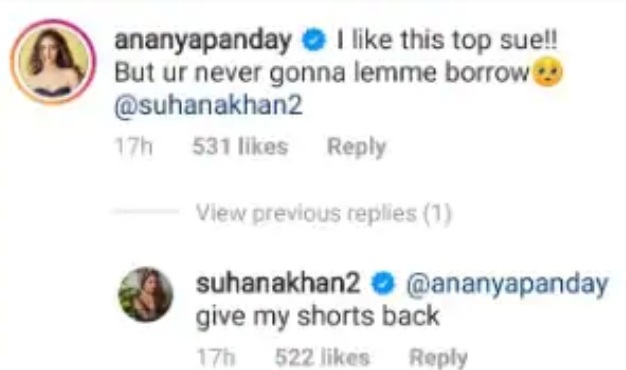 Soon Gauri's post got flooded with a lot of comments and praises for Suhana. But, it was actress Ananya Panday's comment that grabbed the attention a little more. Ananya wrote: "I like this top sue!! But you never gonna lemme borrow @suhanakhan2." Suhana replied to Ananya's comment and demanded her own shorts back first. "Give my shorts back," Suhana responded, leaving netizens in splits.Ananya further commented: "Never..I am wearing it right now and everyday forever."