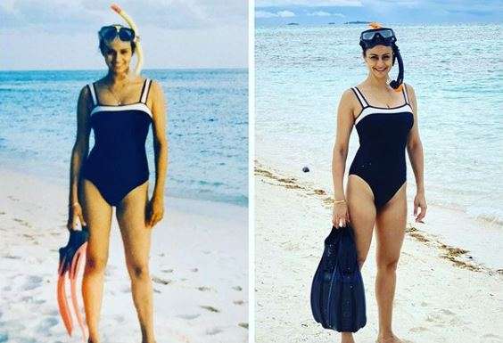 "Then and now. Back in Maldives after twenty years! My Marks & Spencer swimsuit still going strong," Gul captioned the image.