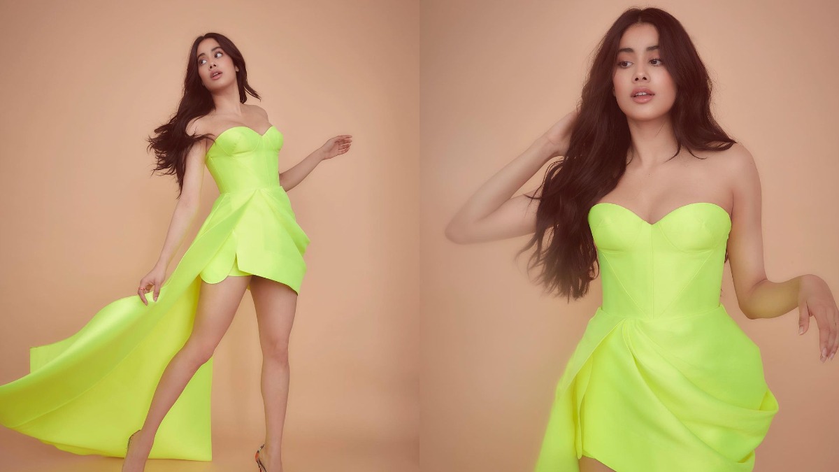 Raising fashion goals, Bollywood star Janhvi Kapoor on Tuesday treated fans to stunning pictures in a neon green ensemble. The 'Gunjan Saxena: The Kargil Girl' actor hopped on to Instagram and shared snaps from a recent photo-shoot. In the pictures, the actor is seen striking a candid pose, while she looks off the camera. With her luscious locks open, the actor personified beauty in a designer mini neon dress that had an attached flair at the back.
