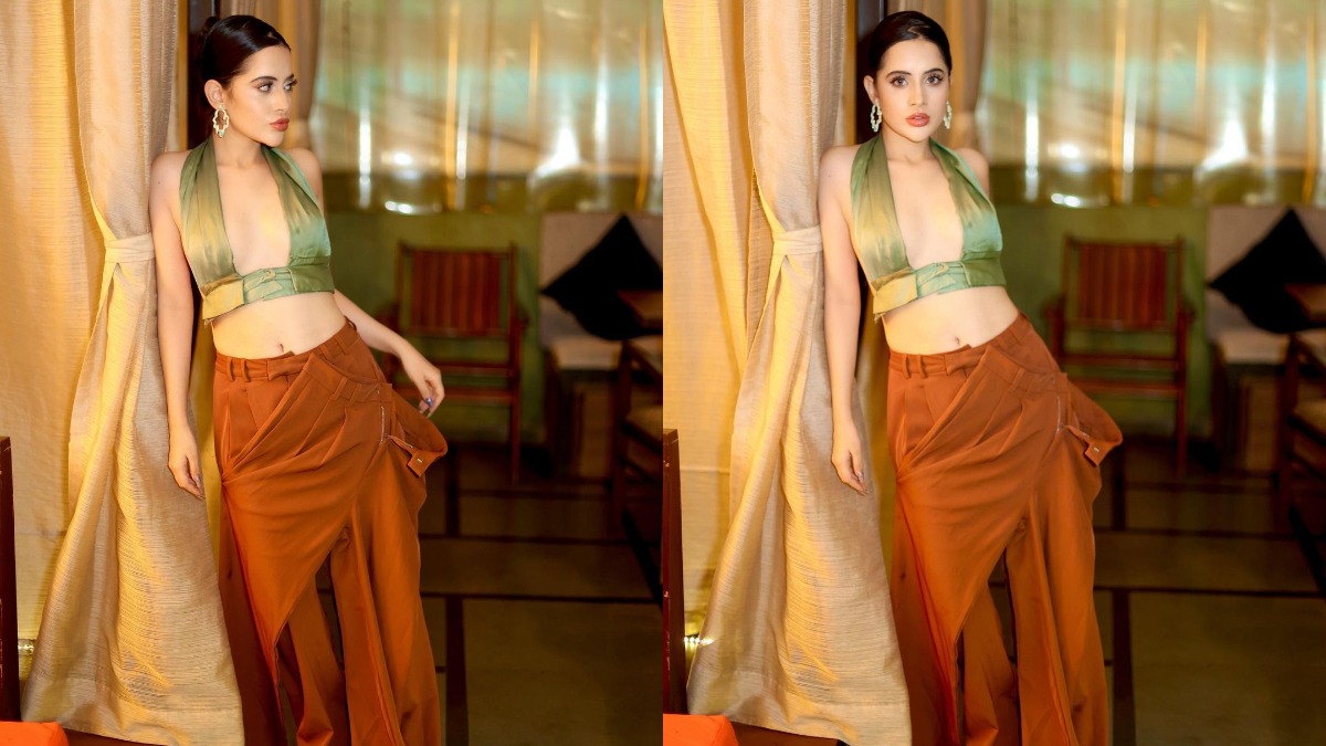 Each time Urfi Javed is spotted by the paparazzi, her outfit becomes the talk of the town. She recently grabbed eyeballs when she stepped out wearing a backless top with two pairs of pants. Several pictures and videos have surfaced online in which Urfi is seen flaunting her new look. Basically, she teamed up her green bralette top with two brown coloured pants - one that she is wearing and the other pinned diagonally with her other pair of pants. The Bigg Boss OTT fame took to Instagram and shared the details of her look. Urfi revealed that her top was made from an old shirt's collar and sleeves. "Pant shirt in my style !! This top is made from the sleeves and collar of my old shirt !! Hair @geetajaiswal422_ Make up mee Outfit @shwetaswardrobe Design meee Styling meee Shot by @sk_click_a_world @theterracejuhu Ps - no fake lashes (sic).