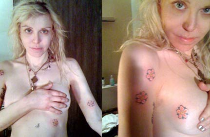The widow of rock legend 'Kurt Cobain' showed off a series of flowers dotted around her body while protecting her modesty with a hand over her chest.
