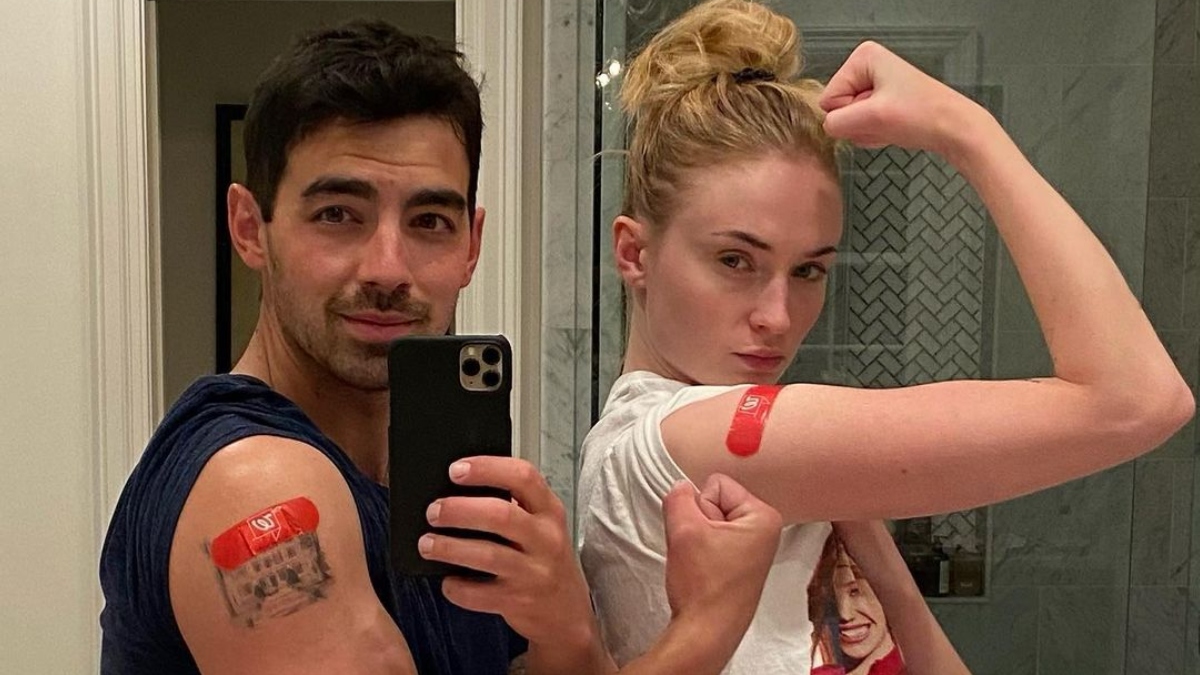 Sophie Turner and Joe Jonas are one of the coolest celebrity couples. From their surprise wedding to featuring together in a music video to their pregnancy, the couple makes sure to add a pinch of adorability in everything they do. In their latest post, the couple shared that they have got vaccinated. While they did not mention what they got vaccinated for, they did post a super cute mirror selfie. In the picture, the couple can be seen standing in front of a mirror and striking a similar pose and flaunting red bandaids on their arms. Captioning the picture, he wrote, "Let’s (NOT) Get It!"