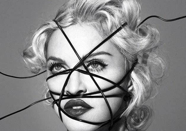 Madonna's cover for the album "Rebel Heart" is a closeup of her face with black string on it.