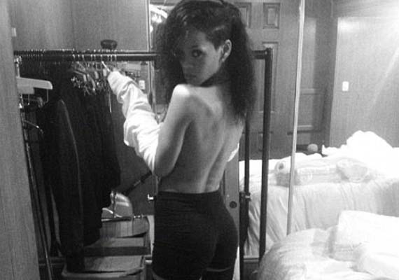 Rihanna shed her top and left her black hot pants on, posing for the camera with her bare back exposed from the waist up, for the picture. Her face was turned provocatively over her shoulder.