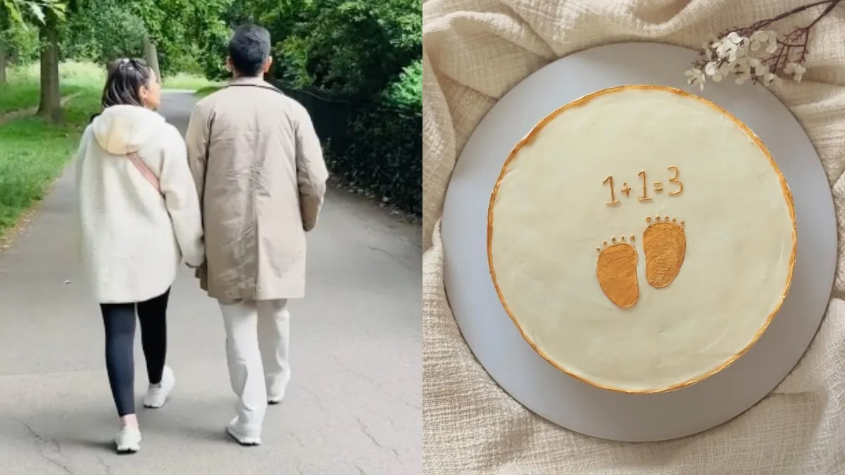 The couple shared a joint post on Instagram with a video of them walking in a park and a cake that reads, '2+2=3'. 'Our little universe … on its way. Blessed beyond measure,' the caption reads.