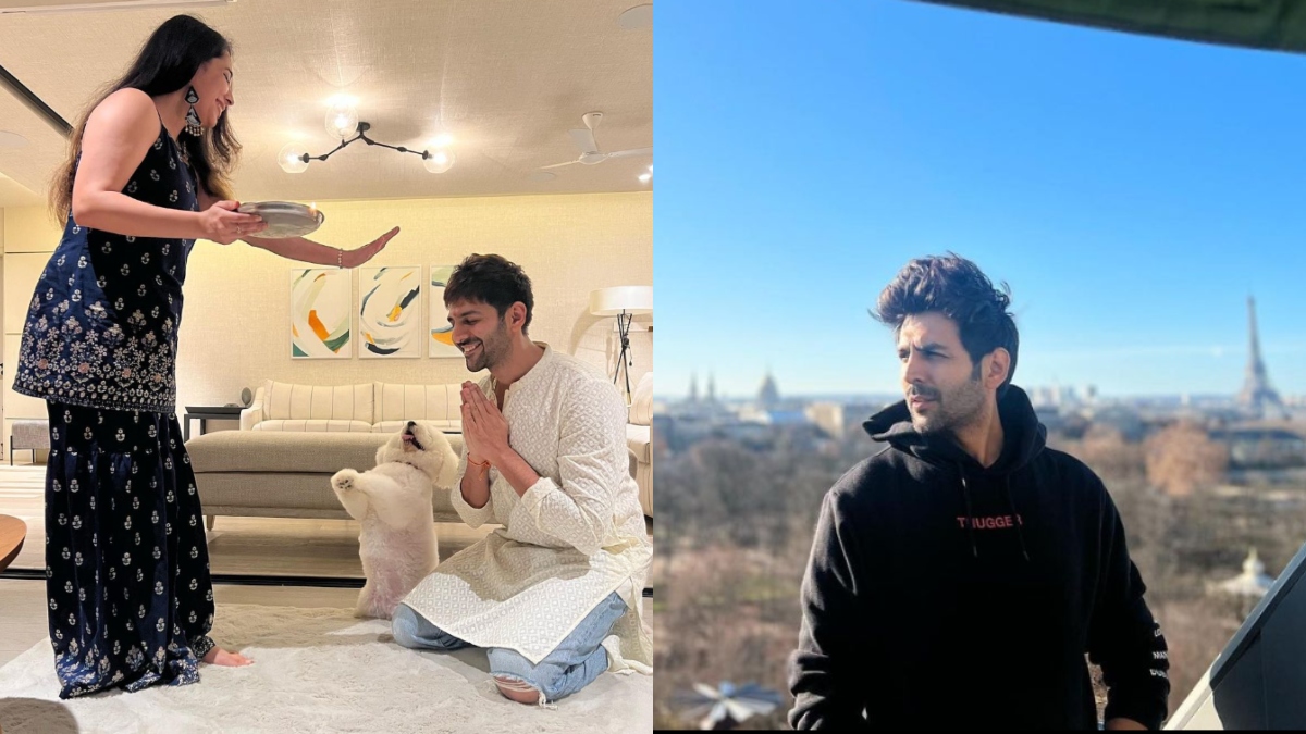 Actor Kartik Aaryan celebrated Raksha Bandhan with his sister Kritika Tiwari on Wednesday. On the festive occasion, he took to his Instagram account to share an adorable picture featuring his sister and his pet dog Katori. In the picture, the actor can be seen sitting on his knees with folded hands, taking blessing of his sister. While his pet dog is trying to imitate him in the most lovable way.