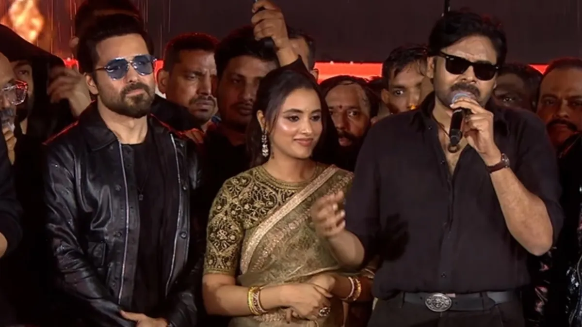 Pawan Kalyan’s much-awaited pre-release event for They Call Him OG lit up Hyderabad’s LB Stadium on Sunday night. The actor-politician made a king-size entry, greeted with thunderous cheers from fans who braved heavy rains to be part of the celebrations. Pawan Kalyan thanked his team and Bollywood co-star Emraan Hashmi, and also expressed gratitude to his loyal fans for staying late into the night despite the weather.