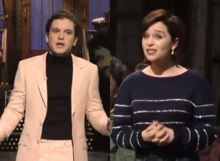 Game of Thrones stars Emilia Clarke and John Bradley crashed Kit Harington's "Saturday Night Live" monologue and demanded spoilers about the final season from him. Jon Snow aka Kit Harington hosted an episode of "Saturday Night Live" on April 6 and had to field questions during his monologue about "who wins 'Game of Thrones'". Some of those questions came from his own co-stars Clarke and Bradley as well as his real-life wife Rose Leslie, reports variety.com.