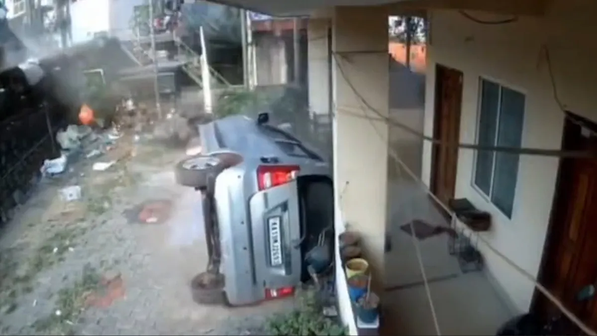 Chilling CCTV footage from the house captured the entire sequence: the car swerving wildly post-tyre failure, hurtling into the compound, and overturning. The video, now viral, has stunned viewers with its intensity, yet the absence of severe injuries.