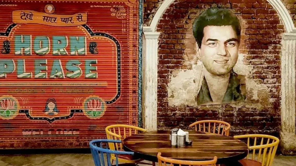Walking into Garam Dharam feels like stepping into a Bollywood set. The interiors are dotted with iconic posters and graffiti of Dharmendra’s most beloved roles. Even the entrance has a playful nod to his famous Sholay bike scene, complete with a water tank.