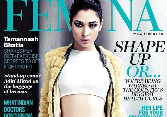 New, Delhi, Tamanna Bhatia looks sizzling hot as she covers the special ‘Fitness' issue of Femina, June 2014 issue. Revealing her toned mid-riffs Tamanna looks smoking hot.