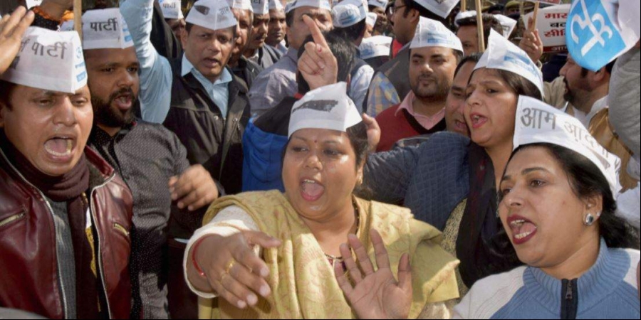 Aam Aadmi Party supporters on Wednesday staged a protest outside the residence of BJP's Delhi unit chief Manoj Tiwari's after he alleged that there was large scale corruption in the construction of classrooms in Delhi government schools.