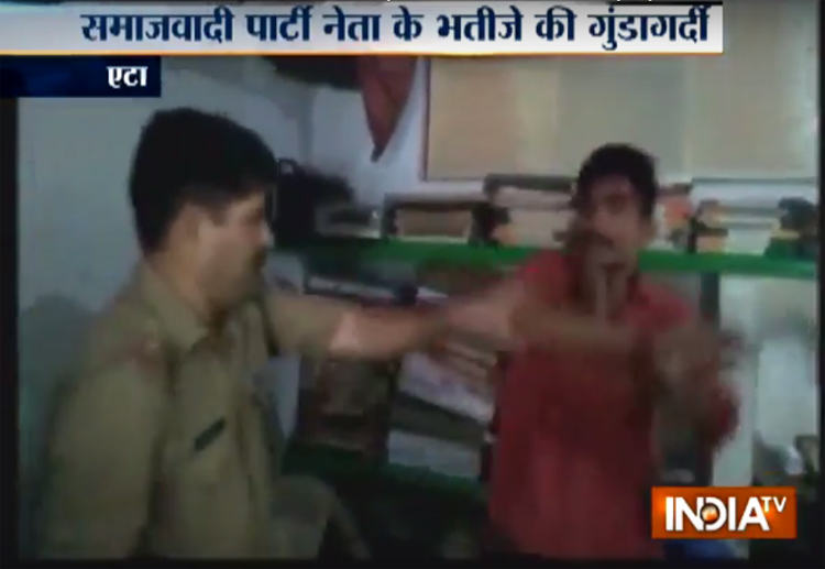 A kin of a Samajwadi Party leader was caught on camera assaulting a cop inside a police station in Etah district of Uttar Pradesh.