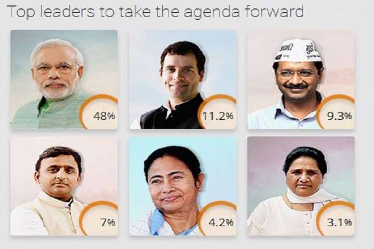 Delhi CM Arvind Kejriwal (9.3 per cent), former Uttar Pradesh CM Akhilesh Yadav (7 per cent), West Bengal CM Mamata Banerjee (4.2 per cent) and BSP chief Mayawati (3.1 per cent) also feature in the list of the leaders.