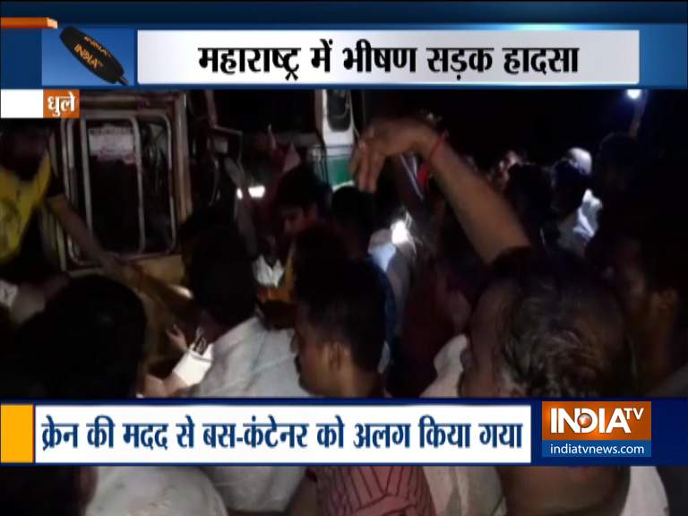 At least 11 people were killed and 15 injured when a container truck collided with a state transport bus coming from the opposite direction in Maharashtra's Dhule district, police said on Monday.