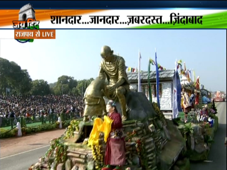Most of the ministers of the Modi government, including Home Minister Rajnath Singh and External Affairs Minister Sushma Swaraj, and former prime ministers Manmohan Singh and Deve Gowda, Congress veteran Ghulam Nabi Azad were among those present on the occasion.The overall theme for the Republic Day celebrations this year is the 150th birth anniversary of Mahatma Gandhi and tableaux of many states, themed on the iconic freedom fighter, are lined up for the occasion.