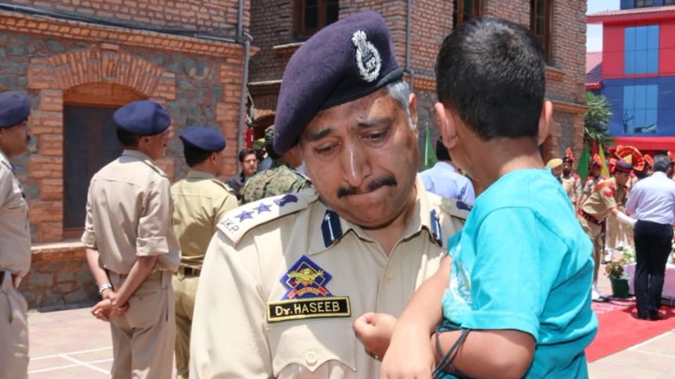 The picture taken during the wreath-laying ceremony in district police lines Srinagar on Monday shows Haseeb Mughal, the Senior Superintendent of Police (SSP) Srinagar, breaking down while carrying the 4-year-old son, Uhbaan of in spector Arshad Khan who died in the AIIMS Delhi on Sunday.